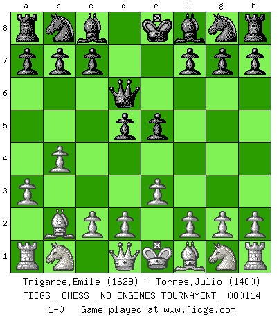 Last move : 1-0 2021 January 10 20:37:10 [Event "FICGS__CHESS__NO_ENGINES_TOURNAMENT__000114"] [Site "FICGS"] [Date "2020.11.26"] [Round "1"] [White "Trigance,Emile"] [Black "Torres,Julio"] [Result "1-0"] [WhiteElo "1629"] [BlackElo "1400"] 1.b4 d5 2.Bb2 Qd6 3.a3 e5 4.e3 1-0 This chess game has been lost on time (started : 2020.11.26 22:31:16) Polish (Sokolsky) opening Player White won this chess game. Follow this game move after move (download)In Chess, just as in life, today's bliss may be tomorrow's poison. (Assaic) Verschiedene, sehr schätzbare und im Laufe des Lebens nützliche Eigenschaften des Geistes können durch das Schachspiel erworben und gekräftigt werden, so dass sie zu Gewohnheiten werden, die uns nie im Stich lassen. (Benjamin Franklin) Cuando le juegas a Fischer, no es una cuestion de si vas a ganar o perder. Es una cuestion de si vas a sobrevivir. (Boris Spassky) Les Cavaliers se révèlent fort utiles dans les positions fermées. D'habitude, les Fous sont un peu plus forts que les Cavaliers dans les positions ouvertes. Qu'on le veuille ou non, il restera toujours des exceptions ! Luck has a peculiar habit of favoring those who don't depend on it. (Author unknown)