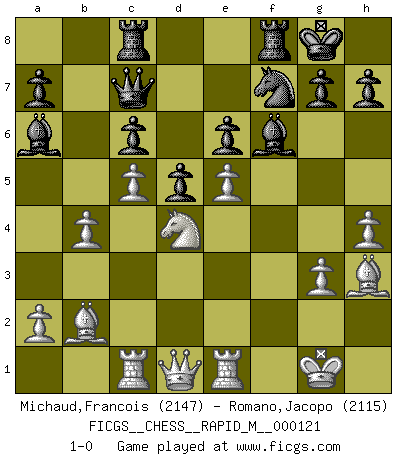 Last move : 1-0 2021 January 13 17:53:8 [Event "FICGS__CHESS__RAPID_M__000121"] [Site "FICGS"] [Date "2020.11.27"] [Round "1"] [White "Michaud,Francois"] [Black "Romano,Jacopo"] [Result "1-0"] [WhiteElo "2147"] [BlackElo "2115"] 1.d4 Nf6 2.c4 e6 3.Nf3 b6 4.g3 Ba6 5.b3 b5 6.cxb5 Bxb5 7.Bg2 d5 8.O-O Nbd7 9.Nc3 Ba6 10.Bb2 Be7 11.Rc1 O-O 12.Na4 Rc8 13.Nc5 Nxc5 14.dxc5 c6 15.Re1 Ne4 16.b4 f5 17.Nd4 Qd7 18.f3 Ng5 19.h4 Nf7 20.e4 fxe4 21.Bh3 Bf6 22.fxe4 Qc7 23.e5 1-0 Queen's Indian : Nimzovich variation (exaggerated Fianchetto) Kingside Castling by player White (move 8) Kingside Castling by player Black (move 11) Player White won this chess game. Follow this game move after move (download)I thought the most common mistake [in chess] was the first one: Learning the game :P (Garvin Gray, FICGS forum) Es tut gut, die Entwicklungsperiode von, [...] demokratischem Geist durchdringen zu lassen. Wie undemokratisch wäre es doch beispielsweise, den einen Offizier große Spaziertouren vornehmen zu lassen, während die anderen zu Hause säßen und sich entsetzlich langweilten. (Aaron Nimzowitsch) El Ajedrez es un expediente tonto que hace creer a la gente inactiva que hacen una cosa muy astuta cuando solamente estan perdiendo su tiempo. (George Bernard Shaw) Nous sommes les pions de la mystérieuse partie d'Echecs jouée par Dieu. Il nous déplace, nous arrête, nous pousse encore, puis nous lance un à un dans la boîte du Néant. Epitaphe sur la tombe de David Janowsky (1868-1927). Methinks King Thibault should dub Marius Zubac a knight of the square board... I mean table, henceforth addressing him as Sir Marius, and bestow on him a suitable land from the kingdom of FICGS & marry him off to a worthy, fair maiden, lest he slice our heads with his mighty sword in his wrath. (Dinesh De Silva)