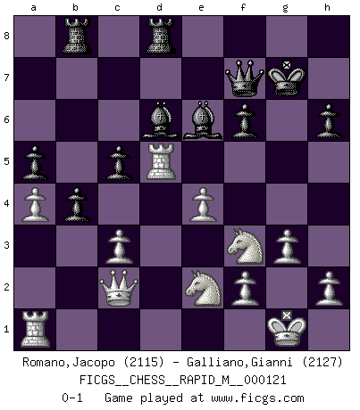 Last move : 0-1 2021 February 8 15:2:4 [Event "FICGS__CHESS__RAPID_M__000121"] [Site "FICGS"] [Date "2020.11.27"] [Round "1"] [White "Romano,Jacopo"] [Black "Galliano,Gianni"] [Result "0-1"] [WhiteElo "2115"] [BlackElo "2127"] 1.d4 d5 2.c4 e6 3.Nf3 Nf6 4.g3 dxc4 5.Bg2 Bb4+ 6.Bd2 a5 7.O-O O-O 8.Bg5 c6 9.Ne5 b5 10.a4 Ra6 11.Nc3 h6 12.Bxf6 gxf6 13.Nf3 Rb6 14.Qc1 Kg7 15.Rd1 Nd7 16.e4 Qc7 17.Qc2 Rb8 18.Nh4 Rd8 19.Ne2 Bd6 20.Bf3 c5 21.d5 b4 22.dxe6 Ne5 23.exf7 Qxf7 24.Rd5 Nxf3+ 25.Nxf3 c3 26.bxc3 Be6 0-1 Queen's gambit declined Kingside Castling by player White (move 7) Kingside Castling by player Black (move 7) Player Black won this chess game. Follow this game move after move (download)By the beauty of his games, the clarity of his play, and the brilliance of his ideas, Fischer made himself an artist of the same stature as Brahms, Rembrandt, and Shakespeare. (David Levy) Ohne Leiden bildet sich kein Charakter. (Ernst Freiherr von Feuchtersleben) Nunca antes ha habido un jugador de Ajedrez con tal conocimiento a fondo de las complejidades del juego y una inmensa voluntad absolutamente indomable de ganar. Yo pienso que Fischer es el jugador mas grande que jamás haya existido. (Lisa Lane) On a dit que l'homme se distingue de l'animal par le fait qu'il achète plus de livres qu'il ne peut en lire. Je voudrais suggérer qu'inclure à la liste des livres quelques livres d'échecs rendrait la distinction manifeste. (Edward Lasker) 98% of all statistics are made up. (Author unknown)