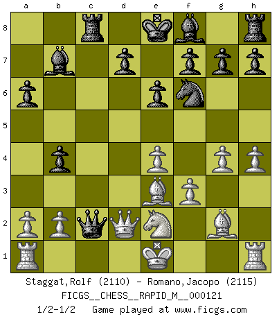 Last move : 1/2-1/2 2021 January 20 13:23:20 [Event "FICGS__CHESS__RAPID_M__000121"] [Site "FICGS"] [Date "2020.11.27"] [Round "1"] [White "Staggat,Rolf"] [Black "Romano,Jacopo"] [Result "1/2-1/2"] [WhiteElo "2110"] [BlackElo "2115"] 1.e4 c5 2.Nf3 e6 3.d4 cxd4 4.Nxd4 Nc6 5.Nc3 Qc7 6.g4 a6 7.h4 b5 8.Nxc6 Qxc6 9.Bg2 b4 10.Ne2 Bb7 11.Be3 Nf6 12.f3 Rc8 13.Qd2 Qxc2 1/2-1/2 Sicilian : Taimanov (Bastrikov) variation This chess game ended in a draw. Follow this game move after move (download)The only thing Chess players have in common is Chess. (Lodewijk Prins) Ich bewundere Kasparows phantasievolle Angriffssiege aus den Achtzigern und Neunzigern, aber wenn man sie mit dem Computer überprüft, nimmt der Computer in jeder zweiten Partie die Opfer an, verteidigt sich und gewinnt. (Vladimir Kramnik) Ciertamente, de todas la drogas del mundo, el Ajedrez debe ser el mas placentero permamentemente. (Assiac) Soyez une menace à chaque fois que vous vous asseyez pour jouer. (Ken Smith) A shortcut is the longest distance between two points. (Don Groves)