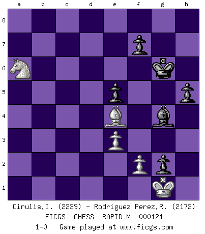 Last move : 1-0 2021 April 10 16:33:30 [Event "FICGS__CHESS__RAPID_M__000121"] [Site "FICGS"] [Date "2020.11.27"] [Round "1"] [White "Cirulis,Ilmars"] [Black "Rodriguez Perez,Rene"] [Result "1-0"] [WhiteElo "2239"] [BlackElo "2172"] 1.c4 Nf6 2.b3 e5 3.Bb2 Bc5 4.e3 d6 5.Nf3 O-O 6.Be2 Bb6 7.d4 e4 8.Nfd2 c6 9.d5 Qe7 10.Nc3 Na6 11.a3 Nc5 12.O-O Bf5 13.b4 Ncd7 14.dxc6 bxc6 15.a4 Ne5 16.b5 Rfc8 17.a5 Bd8 18.a6 cxb5 19.Nxb5 Bb6 20.Bd4 Rab8 21.Rb1 Nc6 22.Ba1 Ne5 23.Nc3 h6 24.h3 Ba5 25.Qa4 Bb6 26.Qc2 Rc6 27.Rb5 Rbc8 28.Qb1 Bg6 29.Na4 Bc7 30.Bxe5 dxe5 31.c5 Rxa6 32.Rb4 Rc6 33.Rb7 Rd8 34.Nc4 Qe8 35.Rxa7 Rb8 36.Rb7 Bf5 37.Rxb8 Bxb8 38.Rd1 Kh7 39.Na5 Rc8 40.Bb5 Qf8 41.Nb7 Qe7 42.c6 h5 43.Nac5 g5 44.Nd7 Bc7 45.Nbc5 Kg7 46.Nxf6 Qxf6 47.Nd7 Qe7 48.Ba6 Rd8 49.Qb7 Bd6 50.Nb6 g4 51.Qxe7 Bxe7 52.Rxd8 Bxd8 53.Nd5 gxh3 54.c7 Bxc7 55.Nxc7 Kg6 56.Bb7 hxg2 57.Na6 Bg4 58.Bxe4+ 1-0 English, 1...Nf6 (Anglo-Indian defense) Kingside Castling by player Black (move 5) Kingside Castling by player White (move 12) Player White won this chess game. Follow this game move after move (download)I have added these principles to the law: get the Knights into action before both Bishops are developed. (Emanuel Lasker) Schach ist eine Sache der genauen Beurteilung, wann man zuschlagen und wann man sich ducken muss. (Robert James Fischer) Robert Fischer es la ley hacia si mismo. (Larry Evans) Le succès, c'est être capable d'aller d'échec en échec sans perdre son enthousiasme. (Winston Churchill) Wisdom begins at the end. (Daniel Webster)