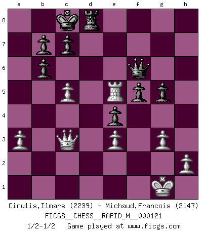 Last move : 1/2-1/2 2021 January 27 19:40:23 [Event "FICGS__CHESS__RAPID_M__000121"] [Site "FICGS"] [Date "2020.11.27"] [Round "1"] [White "Cirulis,Ilmars"] [Black "Michaud,Francois"] [Result "1/2-1/2"] [WhiteElo "2239"] [BlackElo "2147"] 1.c4 e5 2.b3 Nc6 3.Bb2 Nge7 4.e3 d5 5.cxd5 Nxd5 6.Nf3 Bd6 7.d3 Qe7 8.a3 Bg4 9.Be2 f5 10.O-O O-O-O 11.Nbd2 h5 12.Qc2 Rhe8 13.Nc4 Nb6 14.b4 Nxc4 15.dxc4 e4 16.Nd4 Qh4 17.g3 Qh3 18.Rfd1 Bxe2 19.Nxe2 h4 20.c5 hxg3 21.fxg3 Ne5 22.Bxe5 Bxe5 23.Rxd8+ Rxd8 24.Rd1 Rh8 25.Nf4 Qh6 26.Rd5 Qf6 27.b5 g5 28.Ng6 Qxg6 29.Rxe5 Qf6 30.Qc3 Rd8 31.b6 axb6 1/2-1/2 English Opening Kingside Castling by player White (move 10) Queenside Castling by player Black (move 10) This chess game ended in a draw. Follow this game move after move (download)Robert Fischer is a law unto himself. (Larry Evans) Ein bischen Romantik kann weder im Schach noch in der Liebe schaden. Also versuche ich mich ab und zu daran zu erinnern. (Nigel Short) No es una movida, aún la mejor movida que tu debas buscar, sino un plan comprensible. (Eugene Znosko-Borovsky) Shah mat. Le roi est mort. Cri de fierté d'un joueur venant de terrasser son adversaire, courtoisement, sans effusion de sang. The Internet is the world's largest library. It's just that all the books are on the floor. (John Allen Paulos)