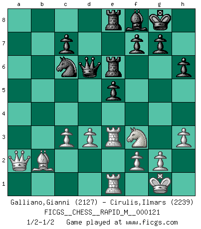 Last move : 1/2-1/2 2021 February 3 22:18:43 [Event "FICGS__CHESS__RAPID_M__000121"] [Site "FICGS"] [Date "2020.11.27"] [Round "1"] [White "Galliano,Gianni"] [Black "Cirulis,Ilmars"] [Result "1/2-1/2"] [WhiteElo "2127"] [BlackElo "2239"] 1.e4 e5 2.Nf3 Nc6 3.Bb5 Nf6 4.d3 Bc5 5.c3 O-O 6.O-O d5 7.exd5 Qxd5 8.Bc4 Qd8 9.Nbd2 h6 10.b4 Bd6 11.Re1 Re8 12.Qc2 a6 13.a3 b5 14.Bb3 a5 15.Bb2 Be6 16.Bxe6 Rxe6 17.Ne4 Nxe4 18.Rxe4 Bf8 19.Rae1 Qd6 20.h3 Rd8 21.R4e3 Rde8 22.bxa5 Nxa5 23.a4 bxa4 24.Qxa4 Nc6 25.Qc4 Nb8 26.Qa2 Nc6 1/2-1/2 Ruy Lopez : Berlin defense Kingside Castling by player Black (move 5) Kingside Castling by player White (move 6) This chess game ended in a draw. Follow this game move after move (download)Excellence at Chess is one mark of a scheming mind. (Sir Arthur Conan Doyle) Wenn Du nicht kämpfst, um anderen etwas zu beweisen, sondern nur für Dich selbst, dann bist du fast unbesiegbar. (Garry Kasparov) Cuando tengas duda... ¡juega al Ajedrez!. (Tevis) Tous ces prétendus hommes politiques sont les pions, les Cavaliers, les Tours ou les Fous d'une partie d'échecs qui se jouera tant qu'un hasard ne renversera pas l'échiquier. (Honoré de Balzac) If you don't practice you don't deserve to win. (Andre Agassi)