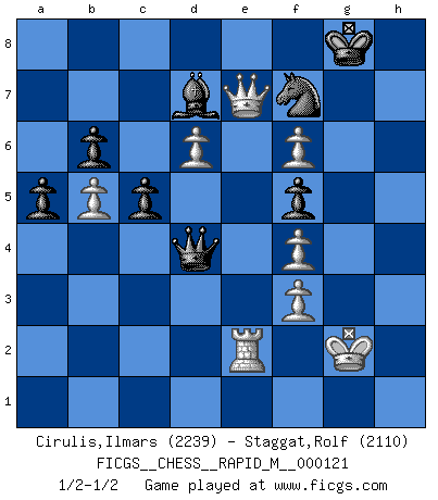 Last move : 1/2-1/2 2021 March 30 12:0:35 [Event "FICGS__CHESS__RAPID_M__000121"] [Site "FICGS"] [Date "2020.11.27"] [Round "1"] [White "Cirulis,Ilmars"] [Black "Staggat,Rolf"] [Result "1/2-1/2"] [WhiteElo "2239"] [BlackElo "2110"] 1.c4 e5 2.b3 Nc6 3.Bb2 g6 4.e3 Bg7 5.Nf3 d6 6.d3 f5 7.Be2 Nf6 8.O-O O-O 9.Nc3 h6 10.h3 a5 11.Nh2 Be6 12.Qd2 Kh7 13.Rad1 Bf7 14.Rfe1 Qe7 15.a3 Be6 16.Qc2 Nd8 17.b4 Nf7 18.Nf3 c6 19.b5 c5 20.Nd2 Rac8 21.Nb3 Ra8 22.a4 Rfe8 23.Ba3 Bd7 24.Nd2 Rab8 25.Bb2 Be6 26.f4 Rbd8 27.Bf3 g5 28.Nf1 Qd7 29.Ne2 h5 30.d4 g4 31.hxg4 hxg4 32.dxe5 gxf3 33.gxf3 Nh5 34.Neg3 Nxg3 35.Nxg3 Nh6 36.Kf2 Qf7 37.exd6 Bxb2 38.Qxb2 Bxc4 39.e4 Re6 40.e5 Rg6 41.Rh1 Rdg8 42.Rh3 Be6 43.Rdh1 Bc8 44.R3h2 Qd5 45.Nh5 Rf8 46.Qc3 Be6 47.Ke3 Bd7 48.Re1 b6 49.Nf6+ R8xf6 50.exf6 Kg8 51.Kf2 Qa2+ 52.Re2 Qxa4 53.Qe5 Qd1 54.Rg2 Rxg2+ 55.Kxg2 Nf7 56.Qe3 Qd4 57.Qe7 1/2-1/2 English Opening Kingside Castling by player White (move 8) Kingside Castling by player Black (move 8) This chess game ended in a draw. Follow this game move after move (download)Let the perfectionist play postal. (Yasser Seirawan) Mutter, ich bin eben Ex-Weltmeister geworden. --beim nach Hause Kommen nach dem Verlust des WM-Titels an Mihail Botvinnik -- (Mikhail Nekhemyevich Tal) En el Ajedrez, cuando menos, el valiente hereda la tierra. (Edmar Mednis) Aidez vos pièces, elles vous aideront. (Paul Morphy) Even the best needles are not sharp at both ends. (Chinese proverb)