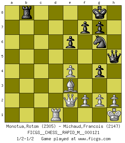 Last move : 1/2-1/2 2021 January 1 22:18:33 [Event "FICGS__CHESS__RAPID_M__000121"] [Site "FICGS"] [Date "2020.11.27"] [Round "1"] [White "Monotua,Rotom"] [Black "Michaud,Francois"] [Result "1/2-1/2"] [WhiteElo "2305"] [BlackElo "2147"] 1.e4 c5 2.d4 cxd4 3.c3 dxc3 4.Nxc3 e6 5.Nf3 Nc6 6.Bc4 Bb4 7.O-O Nge7 8.Qc2 Ng6 9.Rd1 a6 10.Be3 O-O 11.Be2 b5 12.a4 bxa4 13.Nxa4 Rb8 14.Nc5 a5 15.Rac1 Qe7 16.Ne1 Qf6 17.Nxd7 Bxd7 18.Rxd7 Nce5 19.R7d1 Bxe1 20.Rxe1 Rxb2 21.Qc3 a4 22.Kh1 R2b8 23.Bd4 h5 24.Qa1 Rfd8 25.Qxa4 Qh4 26.Be3 Ra8 27.Qb4 Ng4 28.Bxg4 hxg4 29.Qc5 Rdb8 30.Red1 Ra4 31.Rc4 Rxc4 32.Qxc4 Qh5 33.Qe2 1/2-1/2 Sicilian : Smith-Morra gambit Kingside Castling by player White (move 7) Kingside Castling by player Black (move 10) This chess game ended in a draw. Follow this game move after move (download)Fischer is an American Chess tragedy on par with Morphy and Pillsbury. (Mig Greengard) Was ist der Unterschied zwischen einem Strassenarbeiter und einem Schachspieler? --Der Schachspieler bewegt sich ab und zu. (Anonymous) Entre mas años cumplo, mas valoro los Peones. (Keres) Il a essayé de se convaincre qu'il pourrait empêcher toutes les erreurs et ne jamais perdre. L'horreur ! Gary Kasparov au sujet de Robert Fischer. Warrior pose battles inner weakness and wins focus. You see that there is no war within you. You're on your own side, and you are your own strength. (Terri Guillemets)