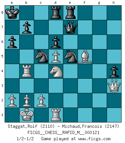 Last move : 1/2-1/2 2021 January 27 18:13:50 [Event "FICGS__CHESS__RAPID_M__000121"] [Site "FICGS"] [Date "2020.11.27"] [Round "1"] [White "Staggat,Rolf"] [Black "Michaud,Francois"] [Result "1/2-1/2"] [WhiteElo "2110"] [BlackElo "2147"] 1.e4 c5 2.Nf3 d6 3.d4 cxd4 4.Nxd4 Nf6 5.Nc3 a6 6.Be3 e5 7.Nb3 Be6 8.f3 h5 9.Nd5 Bxd5 10.exd5 g6 11.Qd2 Nbd7 12.O-O-O Nb6 13.Qa5 Bh6 14.Bxh6 Rxh6 15.Qd2 Rh8 16.f4 Nbd7 17.Be2 Qb6 18.fxe5 Nxe5 19.Qf4 Nfd7 20.h4 O-O-O 21.Rd4 Rhe8 22.Rb4 Qa7 23.Rd1 Nc5 24.Nd4 Qb8 25.g4 hxg4 26.Bxg4+ f5 27.Be2 Qc7 28.h5 gxh5 29.Qxf5+ Kb8 30.Kb1 h4 31.Qh3 Qe7 32.Bg4 Ka8 33.Bf5 1/2-1/2 Sicilian : Najdorf, Byrne (English) attack Queenside Castling by player White (move 12) Queenside Castling by player Black (move 20) This chess game ended in a draw. Follow this game move after move (download)Do you realize Fischer almost never has any bad pieces? He exchanges them, and the bad pieces remain with his opponents. (Yuri Balashov) Wenn Spassky eine Figur opfert kannst du genauso gut aufgeben. Aber wenn Tal eine Figur opfert, spiel weiter. Er könnte noch eine weitere opfern, und dann ... wer weiß? (Miguel Najdorf) La batalla por la última verdad nunca sera ganada. Y es por eso que el Ajedrez es tan fascinante. (Hans Kmoch) Les Cavaliers se révèlent fort utiles dans les positions fermées. D'habitude, les Fous sont un peu plus forts que les Cavaliers dans les positions ouvertes. Qu'on le veuille ou non, il restera toujours des exceptions ! Logic : The art of thinking and reasoning in strict accordance with the limitations and incapacities of the human misunderstanding. (Ambrose Bierce)
