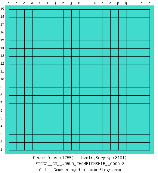 Last move : 0-1 2020 December 28 7:34:17 [Event "FICGS__GO__WORLD_CHAMPIONSHIP__000018"] [Site "FICGS"] [Date "2020.11.27"] [Round "2"] [Black "Cease,Dion"] [White "Uzdin,Sergey"] [Result "0-1"] [Rating 1 "1765"] [Rating 2 "2101"] 0-1 This go game has been lost on time (started : 2020.11.27 21:19:2) Here are the names of the openings (joseki) played in the four corners : Player White won this Go (weiqi, baduk) game. Follow this game move after move (download)A basic: Don't push too hard. (Jansteen) Life is pain my dear and anyone who says otherwise is selling something. (Princess Bride)