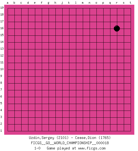 Last move : 1-0 2020 December 31 0:9:15 [Event "FICGS__GO__WORLD_CHAMPIONSHIP__000018"] [Site "FICGS"] [Date "2020.11.27"] [Round "5"] [Black "Uzdin,Sergey"] [White "Cease,Dion"] [Result "1-0"] [Rating 1 "2101"] [Rating 2 "1765"] 1.r16 1-0 This go game has been lost on time (started : 2020.11.27 21:19:2) Here are the names of the openings (joseki) played in the four corners : Player Black won this Go (weiqi, baduk) game. Follow this game move after move (download)Connect with good shape. (Anonymous) Chess is everything: art, science and sport. (Anatoly Karpov)