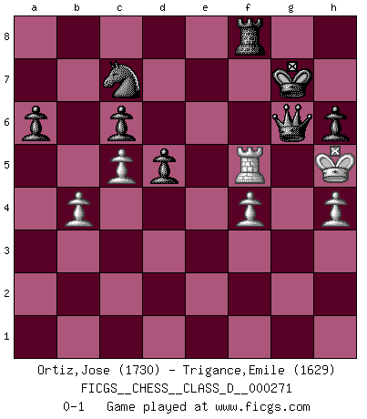 Last move : 0-1 2021 June 12 8:13:39 [Event "FICGS__CHESS__CLASS_D__000271"] [Site "FICGS"] [Date "2020.12.02"] [Round "1"] [White "Ortiz,Jose"] [Black "Trigance,Emile"] [Result "0-1"] [WhiteElo "1730"] [BlackElo "1629"] 1.g3 d5 2.Bg2 c5 3.d4 e6 4.Bf4 Bd6 5.e3 Bxf4 6.exf4 Nf6 7.dxc5 Qa5+ 8.c3 Qxc5 9.Ne2 Nc6 10.b4 Qe7 11.O-O O-O 12.a4 a6 13.Nd2 e5 14.Re1 e4 15.Nd4 Nxd4 16.h3 Ne6 17.Rc1 Bd7 18.f3 Bc6 19.Re3 exf3 20.Nxf3 Ne4 21.Ne5 f5 22.Kh2 Rad8 23.Qe1 Bxa4 24.c4 Bc6 25.c5 Qf6 26.Rb3 g5 27.Qe3 Rde8 28.Nxc6 bxc6 29.Ra3 Nc7 30.Qe2 Nxg3 31.Rxg3 Rxe2 32.Rxg5+ Kf7 33.h4 h6 34.Rh5 Rxg2+ 35.Kxg2 Qb2+ 36.Kh3 Qxc1 37.Rxf5+ Kg7 38.Kg4 Qg1+ 39.Kh5 Qg6+ 0-1 Benko's Opening Kingside Castling by player White (move 11) Kingside Castling by player Black (move 11) Player Black won this chess game. Follow this game move after move (download)A chess genius has died; a loss for humanity. (Viktor Kortchnoi, about Bobby Fischer's death) Die Elozahlen sind sehr schlecht für das Schach. Jetzt ist Schach eine Sportindustrie, die darauf zielt Elopunkte zu machen. (Miguel Najdorf) En la perfecta combinación de Ajedrez como en una historia corta de primera clase, toda la trama y contra trama deberá conducir hacia un final sorprendente, el interes no es mitigado hasta el último momento. (Yates and Winter) L'attaque fait le spectacle, la défense gagne les matchs. (Dicton footballistique) Luck is the residue of design. (John Milton)