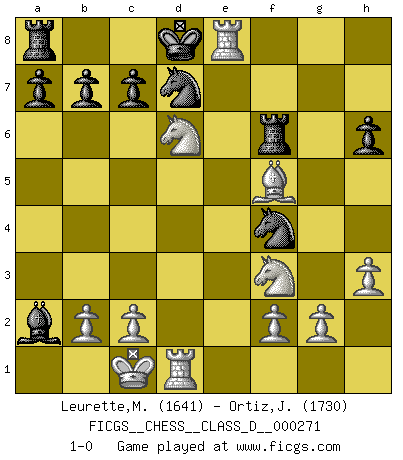Last move : 1-0 2021 January 22 7:44:17 [Event "FICGS__CHESS__CLASS_D__000271"] [Site "FICGS"] [Date "2020.12.02"] [Round "1"] [White "Leurette,Marc-Antoine"] [Black "Ortiz,Jose"] [Result "1-0"] [WhiteElo "1641"] [BlackElo "1730"] 1.e4 e5 2.Nf3 d6 3.d4 Nf6 4.Nc3 Bg4 5.dxe5 Nh5 6.exd6 Bxd6 7.h3 Be6 8.e5 Be7 9.Qxd8+ Kxd8 10.Bg5 f6 11.O-O-O Nd7 12.exf6 gxf6 13.Bh4 Rf8 14.Bd3 h6 15.Rhe1 Bf7 16.Bf5 Bd6 17.Ne4 Bxa2 18.Nxd6 Nf4 19.Bxf6+ Rxf6 20.Re8+ 1-0 Philidor : Nimzovich (Jaenisch) variation Queenside Castling by player White (move 11) Player White won this chess game. Follow this game move after move (download)Only the player with the initiative has the right to attack. (Wilhelm Steinitz) Wie gewinnt Tal? Er entwickelt alle seine Figuren in die Brettmitte und opfert sie dann irgendwo. (Robert James Fischer) Todo lo que importa ante el tablero de Ajedrez son buenas jugadas. (Bobby Fischer) Votre seul travail dans les ouvertures est d'obtenir un milieu de partie jouable. (Lajos Portish) An expert is a man who has made all the mistakes which can be made in a very narrow field. (Niels Bohr)