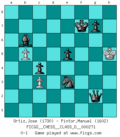 Last move : 0-1 2021 June 12 1:51:53 [Event "FICGS__CHESS__CLASS_D__000271"] [Site "FICGS"] [Date "2020.12.02"] [Round "1"] [White "Ortiz,Jose"] [Black "Pintor,Manuel"] [Result "0-1"] [WhiteElo "1730"] [BlackElo "1602"] 1.e4 e5 2.Bc4 Qf6 3.Nf3 Bc5 4.O-O d6 5.d3 Bg4 6.Bg5 Qg6 7.Bd2 Nf6 8.Nc3 O-O 9.Be3 Nc6 10.h3 Bxh3 11.Nh4 Bg4 12.Nxg6 Bxd1 13.Raxd1 hxg6 14.Na4 Bb4 15.c3 Ba5 16.f3 Ne7 17.Rd2 c6 18.b4 Bc7 19.f4 Ng4 20.Rf3 Nxe3 21.Rxe3 b5 22.fxe5 dxe5 23.Nc5 bxc4 24.d4 a5 25.a3 axb4 26.axb4 Ra1+ 27.Kf2 f5 28.Ne6 f4 29.Nxf8 fxe3+ 30.Kxe3 Kxf8 31.g4 g5 32.d5 cxd5 33.Re2 Bb6+ 34.Kd2 Ra2+ 35.Kd1 Rxe2 36.Kxe2 dxe4 37.Kd2 Nd5 38.Kc2 Ne3+ 39.Kd2 Nxg4 40.Ke2 Ne3 41.b5 g4 42.Kf2 Nd1+ 43.Kg3 e3 44.Kg2 e2 45.Kg3 e1Q+ 46.Kxg4 Qf2 47.Kg5 Kf7 48.Kg4 Ne3+ 49.Kh5 Qg2 0-1 Bishop's Opening Kingside Castling by player White (move 4) Kingside Castling by player Black (move 8) Promotion Queen by player Black (move 45) 10 pieces endgame at move 46 : White KPP , Black KQBNPPP WHITE : King + 2 Pawns BLACK : King + 1 Queen 1 Bishop 1 Knight 3 Pawns Player Black won this chess game. Follow this game move after move (download)At this time Fischer is simply a level above all the best Chessplayers in the world. (John Jacobs) Obwohl ich vom Stil her kaum zu den Priestern der Schachkunst gezählt werde, halte ich Schach doch für eine Kunst. (Tigran Petrosjan) Una buena ofensiva y una buena defensa, comienzan ambas con un buen desarrollo. (Bruce A. Moon) La solitude du joueur d'Echecs à l'approche du mat est semblable à celle du condamné. (Francis Szpiner) I live to kill Traxler counterattack. (Ilmars Cirulis)