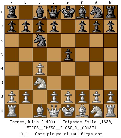 Last move : 0-1 2021 January 13 1:21:0 [Event "FICGS__CHESS__CLASS_D__000271"] [Site "FICGS"] [Date "2020.12.02"] [Round "1"] [White "Torres,Julio"] [Black "Trigance,Emile"] [Result "0-1"] [WhiteElo "1400"] [BlackElo "1629"] 1.c4 e5 2.Nc3 Nc6 0-1 This chess game has been lost on time (started : 2020.12.02 23:16:16) English : Sicilian Reversed Player Black won this chess game. Follow this game move after move (download)A man without frontiers. He didn't divide the East and the West, he brought them together in their admiration for him. (Ljubomir Ljubojevic, about Bobby Fischer's death) Privat ist Kortschnoi kein schlechter Mensch, sehr sympathisch. Aber während des Spiels ist er grausam. Er will dich töten. (Miguel Najdorf) Cada Peón es potencialmente una Reina. (James Mason) Les échecs, c'est la lutte contre l'erreur. (Johannes Zukertort) A shortcut is the longest distance between two points. (Don Groves)