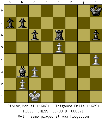 Last move : 0-1 2020 December 16 17:37:0 [Event "FICGS__CHESS__CLASS_D__000271"] [Site "FICGS"] [Date "2020.12.02"] [Round "1"] [White "Pintor,Manuel"] [Black "Trigance,Emile"] [Result "0-1"] [WhiteElo "1602"] [BlackElo "1629"] 1.e4 d5 2.exd5 Qxd5 3.Nc3 Qa5 4.d4 Nf6 5.Bd2 Bg4 6.f3 Bh5 7.Bc4 c6 8.g4 Bg6 9.Nd5 Qd8 10.Nxf6+ exf6 11.c3 Bd6 12.f4 Be4 13.Qe2 Qe7 14.O-O-O Bxh1 15.Qf2 O-O 16.Re1 Qc7 17.Ne2 Bd5 18.Bd3 Bxa2 19.Qh4 g6 20.f5 Re8 21.g5 fxg5 22.Bxg5 Bf8 23.f6 Bd5 24.Bh6 Qd6 25.Rf1 Bxh6+ 26.Qxh6 Qf8 27.Qg5 h6 28.Qg3 Kh7 29.Nf4 Qg8 30.h4 Kh8 31.Rg1 Nd7 32.Nxg6+ fxg6 33.Qf4 Bf7 34.Bxg6 Re1+ 35.Rxe1 Qxg6 36.Rf1 Bb3 37.Rf2 Rf8 38.Qf5 Qxf5 39.Rxf5 Rxf6 40.Re5 Nxe5 41.dxe5 Re6 0-1 Scandinavian (centre counter) defense Queenside Castling by player White (move 14) Kingside Castling by player Black (move 15) Player Black won this chess game. Follow this game move after move (download)It is difficult to play against Einstein's theory --on his first loss to Fischer. (Mikhail Tal) Die FIDE ist dabei in die Hände der russischen Mafia zu fallen. (Larry Evans) Cuando no sepas que mover, espera por una idea que se le venga a la la cabeza de tu oponente. Tenlo por seguro de que esa idea estará incorrecta. (Siegbert Tarrasch) Les sacrifices démontrent seulement que quelqu'un a gaffé. (Savielly Tartacover) The next best thing to gambling and winning is gambling and loosing. (Nick Dandalos)