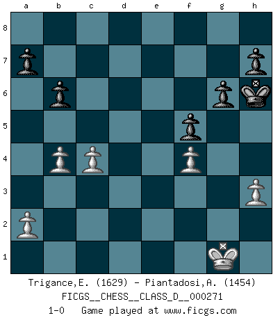 Last move : 1-0 2021 March 13 2:41:33 [Event "FICGS__CHESS__CLASS_D__000271"] [Site "FICGS"] [Date "2020.12.02"] [Round "1"] [White "Trigance,Emile"] [Black "Piantadosi,Angelo"] [Result "1-0"] [WhiteElo "1629"] [BlackElo "1454"] 1.e4 e6 2.d4 d5 3.Nc3 dxe4 4.Nxe4 Nd7 5.Nf3 Ngf6 6.Nxf6+ Nxf6 7.Bd3 Be7 8.O-O O-O 9.Ne5 c5 10.dxc5 Bxc5 11.Bg5 Be7 12.Re1 Nd7 13.Qh5 g6 14.Bxe7 Qxe7 15.Qf3 Nxe5 16.Rxe5 Rb8 17.Re2 Bd7 18.Rd1 Bc6 19.Be4 Bxe4 20.Qxe4 b6 21.Red2 Rfd8 22.g3 Rxd2 23.Rxd2 Rd8 24.Qe3 Rxd2 25.Qxd2 Kg7 26.c4 Qc5 27.b3 Qe5 28.f4 Qc5+ 29.Kg2 Qf5 30.Qd4+ Kh6 31.Qd2 Qe4+ 32.Kg1 f5 33.Qf2 e5 34.fxe5 Qxe5 35.Qf4+ Qxf4 36.gxf4 Kh5 37.h3 Kh6 38.b4 1-0 French : Rubinstein variation Kingside Castling by player White (move 8) Kingside Castling by player Black (move 8) Player White won this chess game. Follow this game move after move (download)In Chess, just as in life, today's bliss may be tomorrow's poison. (Assaic) Ich las kürzlich ein Buch von Nietzsche. Er sagte Religion verdumme nur die Menschen. Ich stimme zu. (Robert James Fischer) Nos gusta pensar. (Gary Kasparov) On n'a jamais que l'âge auquel on a commence à jouer aux échecs car après on cesse de vieillir. (Capablanca) There will be no order, only chaos. (Sol Robeson in Pi by Darren Aronofsky)