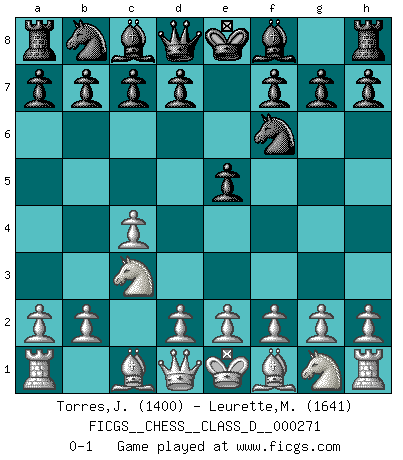 Last move : 0-1 2021 January 13 1:21:0 [Event "FICGS__CHESS__CLASS_D__000271"] [Site "FICGS"] [Date "2020.12.02"] [Round "1"] [White "Torres,Julio"] [Black "Leurette,Marc-Antoine"] [Result "0-1"] [WhiteElo "1400"] [BlackElo "1641"] 1.c4 e5 2.Nc3 Nf6 0-1 This chess game has been lost on time (started : 2020.12.02 23:16:16) English Opening Player Black won this chess game. Follow this game move after move (download)The passed Pawn is a criminal, who should be kept under lock and key. Mild measures, such as police surveillance, are not sufficient. (Aaron Nimzovich) Die Idee von Capablanca, Schach als Fach in den Schulen zu lehren, ist großartig. (Fidel Castro) En la perfecta combinación de Ajedrez como en una historia corta de primera clase, toda la trama y contra trama deberá conducir hacia un final sorprendente, el interes no es mitigado hasta el último momento. (Yates and Winter) Le joueur d'Echecs qui veut atteindre le top est obligé de développer son propre credo créatif. Alexeï Stepanovicth Souétine. Il est facile d'écrire des livres ! Ce qui est difficile, c'est de jouer ! (Alexeï Stepanovicth Souétine) Empty your mind, be formless, shapeless — like water. (Bruce Lee)