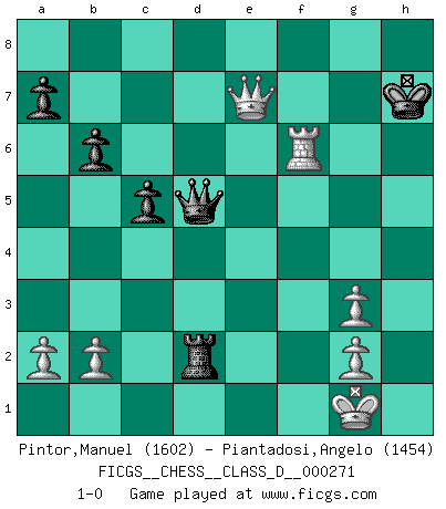 Last move : 1-0 2021 January 7 23:49:35 [Event "FICGS__CHESS__CLASS_D__000271"] [Site "FICGS"] [Date "2020.12.02"] [Round "1"] [White "Pintor,Manuel"] [Black "Piantadosi,Angelo"] [Result "1-0"] [WhiteElo "1602"] [BlackElo "1454"] 1.e4 Nf6 2.Nc3 d5 3.exd5 Nxd5 4.Nxd5 Qxd5 5.d4 c5 6.Nf3 e6 7.c4 Qd8 8.d5 exd5 9.cxd5 Bd6 10.Bb5+ Bd7 11.Bxd7+ Nxd7 12.O-O O-O 13.Bg5 f6 14.Bh4 Re8 15.Qb3 b6 16.Rae1 Ne5 17.Re3 Nxf3+ 18.Rxf3 Qc7 19.Kh1 Re4 20.Bg3 Bxg3 21.fxg3 Qd6 22.h4 Rae8 23.Kh2 Rxh4+ 24.Kg1 Rd4 25.Rf5 g6 26.Rxf6 Qxd5 27.Qc2 Rd2 28.Rxg6+ hxg6 29.Qxg6+ Kh8 30.Qxe8+ Kg7 31.Qf8+ Kg6 32.Rf6+ Kh7 33.Qe7+ 1-0 Alekhine's defense : Scandinavian variation Kingside Castling by player White (move 12) Kingside Castling by player Black (move 12) Player White won this chess game. Follow this game move after move (download)A good sacrifice is one that is not necessarily sound but leaves your opponent dazed and confused. (Rudolph Spielmann) Ihnen, Herr Lasker, habe ich nur drei Worte zu sagen: Schach und matt. (Siegbert Tarrasch) El sobresalir en el Ajedrez es un signo de una mente intrigante. (Sir Arthur Conan Doyle) L'attaque fait le spectacle, la défense gagne les matchs. (Dicton footballistique) Always be a first-rate version of yourself, instead of a second-rate version of somebody else. (Judy Garland)
