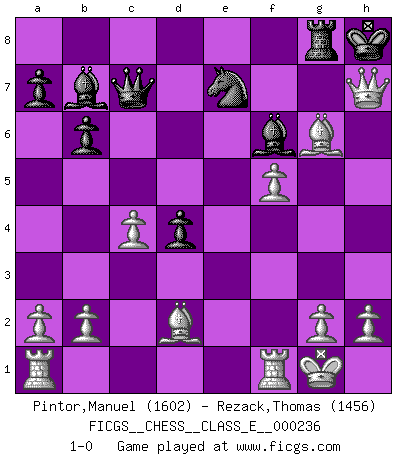 Last move : 1-0 2021 January 16 17:37:42 [Event "FICGS__CHESS__CLASS_E__000236"] [Site "FICGS"] [Date "2020.12.02"] [Round "1"] [White "Pintor,Manuel"] [Black "Rezack,Thomas"] [Result "1-0"] [WhiteElo "1602"] [BlackElo "1456"] 1.e4 c5 2.f4 g6 3.Nf3 d6 4.Bc4 e6 5.O-O Bg7 6.Nc3 Ne7 7.d3 O-O 8.Ng5 d5 9.exd5 exd5 10.Bb3 Nbc6 11.Qf3 Bd7 12.Nxd5 Nxd5 13.Qxd5 b6 14.Nxf7 Rxf7 15.Qxf7+ Kh8 16.c3 Qc7 17.Bd2 Rf8 18.Qd5 Ne7 19.Qf3 Bc6 20.Qh3 Nd5 21.Bc2 Bb7 22.d4 cxd4 23.Bxg6 Bf6 24.c4 Rg8 25.f5 Ne7 26.Qxh7+ 1-0 Sicilian : Grand Prix attack Kingside Castling by player White (move 5) Kingside Castling by player Black (move 7) Player White won this chess game. Follow this game move after move (download)The passion for playing Chess is one of the most unaccountable in the world. (H.G. Wells) Ich verlor meine Bürgerrechte, mein Gehalt wurde mir nicht mehr bezahlt und ich wurde zensiert und durfte nicht mehr ins Ausland reisen. [nach dem Match Fischer-Taimanov 6:0] (Mark Taimanov) El jugador blanco perdió porque fallo en recordar la coreccta continuación y tuvo que pensar por sí mismo las movidas. (Siegbert Tarrasch) Celui qui prend des risques peut perdre, celui qui n'en prend pas perd toujours. (Xavier Tartacover) It's not the will to win, but the will to prepare to win that makes the difference. (Bear Bryant)