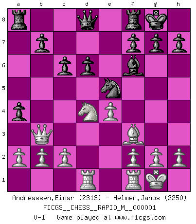 Last move : 0-1 2006 April 29 8:56:11 [Event "FICGS__CHESS__RAPID_M__000001"] [Site "FICGS"] [Date "2006.04.10"] [Round "1"] [White "Andreassen,Einar"] [Black "Helmer,Janos"] [Result "0-1"] [WhiteElo "2313"] [BlackElo "2250"] 1.e4 e5 2.Nf3 Nc6 3.Bb5 Nge7 4.Nc3 d6 5.O-O Bd7 6.d4 Ng6 7.Be3 Be7 8.Qd2 O-O 9.Rad1 Bg4 10.Be2 Bxf3 11.Bxf3 exd4 12.Bxd4 Nxd4 13.Qxd4 Bf6 14.Qb4 a5 15.Qb3 c6 16.Ne2 Ne5 17.Nd4 a4 0-1 Ruy Lopez : Cozio defense Kingside Castling by player White (move 5) Kingside Castling by player Black (move 8) Player Black won this chess game. Follow this game move after move (download)On the chessboard, lies and hypocrisy do not survive long. (Emanuel Lasker) Wir können eben der zündenden Macht des Opfers nicht wiederstehen, denn die Begeisterung für das Opfer liegt in der Natur des Menschen. (Rudolf Spielmann) Cualquier cambio de material en una posición debe venir por medio de un mate, una captura o promoción de Peón. (Purdy) Je crois qu'il existe des manières très spécifiques de jouer efficacement contre une machine. Evidemment, nous n'avons aucune chance en technique pure, parce que l'ordinateur calcule de manière parfaite. Mais lorsque nous faisons appel à notre cerveau, en utilisant l'intuition et la compréhension, alors nous restons beaucoup plus forts. (Anatoli Karpov) The modern world has divided itself into Conservatives and Progressives. The business of Progressives is to go on making mistakes. The business of the Conservatives is to prevent the mistakes from being corrected. (G.K. Chesterton)