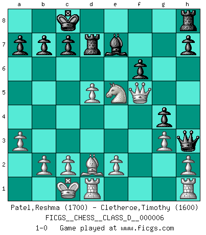 Last move : 1-0 2006 June 28 23:37:41 [Event "FICGS__CHESS__CLASS_D__000006"] [Site "FICGS"] [Date "2006.06.22"] [Round "1"] [White "Patel,Reshma"] [Black "Cletheroe,Timothy"] [Result "1-0"] [WhiteElo "1700"] [BlackElo "1600"] 1.f4 e5 2.fxe5 Qh4+ 3.g3 Qh5 4.Nf3 d6 5.d4 Bh3 6.Qd3 Nd7 7.Bf4 dxe5 8.Nxe5 O-O-O 9.Nd2 f6 10.Nxd7 Rxd7 11.Bxh3 Qxh3 12.O-O-O Ne7 13.Nf3 g5 14.Bd2 Nc6 15.a3 g4 16.Qf5 Be7 17.d5 Ne5 18.Nxe5 1-0 Bird : From gambit Queenside Castling by player Black (move 8) Queenside Castling by player White (move 12) Player White won this chess game. Follow this game move after move (download)No one ever won a game by resigning. (Unknown) Ich verachte Kasparow. (Viktor Kortschnoi) Un Peón pasado es un criminal, quién debe ser mantenido bajo candado y llave. Leves medidas, tales como vigilancia policiaca, no son suficientes. (Aaron Nimzovich) Le génie consiste à savoir transgresser les règles au moment opportun. (Teichmann) The faster the computer, the slower the brain. (Thibault de Vassal)