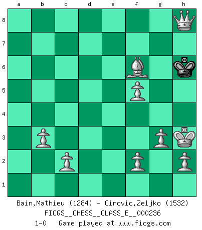 Last move : 1-0 2021 September 5 1:38:50 [Event "FICGS__CHESS__CLASS_E__000236"] [Site "FICGS"] [Date "2020.12.02"] [Round "1"] [White "Bain,Mathieu"] [Black "Cirovic,Zeljko"] [Result "1-0"] [WhiteElo "1284"] [BlackElo "1532"] 1.e4 e5 2.Nf3 Nc6 3.Bb5 a6 4.Ba4 Nf6 5.O-O Be7 6.Re1 d6 7.Bxc6+ bxc6 8.d4 Bg4 9.dxe5 Bxf3 10.Qxf3 dxe5 11.Nd2 h6 12.Nc4 Bd6 13.Qg3 g5 14.b3 Qe7 15.Bb2 Nd7 16.Rad1 O-O-O 17.Qh3 g4 18.Qxg4 Rdg8 19.Qe2 Qg5 20.Nxd6+ cxd6 21.Qxa6+ Kd8 22.g3 Ke7 23.Qxc6 Rg6 24.Ba3 Rd8 25.Rxd6 Rxd6 26.Rd1 Nb8 27.Bxd6+ Kf6 28.Bxb8 Kg7 29.Bxe5+ Kh7 30.Rxd8 Qxd8 31.a4 h5 32.Kg2 h4 33.Qf6 h3+ 34.Kxh3 Qd7+ 35.Qf5+ Qxf5+ 36.exf5 f6 37.Bxf6 Kh6 38.a5 Kh5 39.a6 Kh6 40.a7 Kh7 41.a8Q Kh6 42.Qh8+ 1-0 Ruy Lopez : Closed, Averbach variation Kingside Castling by player White (move 5) Queenside Castling by player Black (move 16) 10 pieces endgame at move 37 : White KBPPPPPPP , Black K WHITE : King + 1 Bishop 7 Pawns BLACK : King + Promotion Queen by player White (move 41) Player White won this chess game. Follow this game move after move (download)My opponents make good moves too. Sometimes I don't take these things into consideration. (Bobby Fischer) Das Schachspiel übertrifft alle anderen Spiele so weit wie der Chimborasso einen Misthaufen. (Arthur Schopenhauer) En un gambito tu regalas un Peón por el bién de tomar un juego perdido. (Samuel Standige Boden) Le jeu d'échecs fait naître et fortifie en nous plusieurs qualités précieuses dans le cours de l'existence, telles que la prévoyance, la circonspection, la prudence, et la persévérance. (Benjamin Franklin - 1783, la morale des échecs) The ultimate in disposing one's troops is to be without ascertainable shape. Then the most penetrating spies cannot pry in nor can the wise lay plans against you. (Sun Tzu)