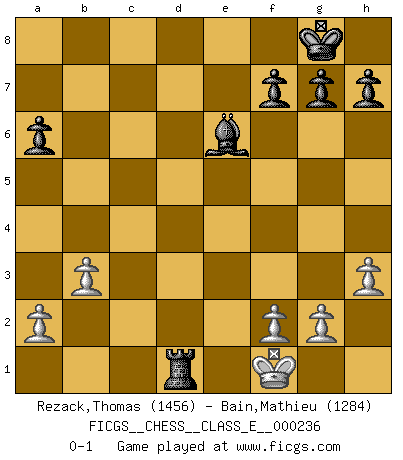 Last move : 0-1 2021 March 30 15:29:22 [Event "FICGS__CHESS__CLASS_E__000236"] [Site "FICGS"] [Date "2020.12.02"] [Round "1"] [White "Rezack,Thomas"] [Black "Bain,Mathieu"] [Result "0-1"] [WhiteElo "1456"] [BlackElo "1284"] 1.e4 c5 2.Nf3 d6 3.d4 cxd4 4.Nxd4 Nf6 5.Nc3 a6 6.Be2 e5 7.Nf3 Be7 8.O-O O-O 9.Be3 Be6 10.b3 b5 11.Ng5 Bd7 12.Nf3 Bc6 13.Bd3 Nbd7 14.Qe2 d5 15.exd5 Nxd5 16.Nxd5 Bxd5 17.Rad1 e4 18.Bxe4 Bxe4 19.Ne5 Bf5 20.c4 Qe8 21.cxb5 Nxe5 22.Rd5 Bf6 23.Rfd1 Be6 24.R5d2 Qxb5 25.Qe1 Nc6 26.Rd6 Be5 27.R6d2 Bc3 28.h3 Bxd2 29.Bxd2 Nd4 30.Be3 Nc2 31.Qd2 Nxe3 32.Qxe3 Rad8 33.Rf1 Rd3 34.Qf4 Rfd8 35.Qc1 Rd2 36.Qa1 Qxf1+ 37.Kxf1 Rd1+ 38.Qxd1 Rxd1+ 0-1 Sicilian : Najdorf, Opovcensky variation Kingside Castling by player White (move 8) Kingside Castling by player Black (move 8) Player Black won this chess game. Follow this game move after move (download)Bobby is the finest Chess player this country ever produced. His memory for the moves, his brilliance in dreaming up combinations, and his fierce determination to win are uncanny. (John Collins) Schon mancher Spieler hat aufgegeben, um zu vermeiden, daß er eine Figur verliert. (Savielly Grigorievitsch Tartakower) Con el fin de mejorar tu juego, debes de estudiar los finales antes que todo, ya que mientras que los finales pueden ser estudiados y dominados por sí mismos, el juegomedio y la apertura deben de ser estudiados en relación con los finales. (José Raúl Capablanca) Les Echecs mettent en conflit, non pas deux intelligences, mais deux volontés. (Lasker) Vladimir Ras-Putin is still alive... He is also a good actor, I saw him in the Lord of the Rings. (Rodolfo d'Ettorre)