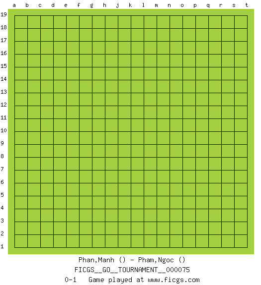 Last move : 0-1 2021 January 2 16:43:29 [Event "FICGS__GO__TOURNAMENT__000075"] [Site "FICGS"] [Date "2020.12.03"] [Round "1"] [Black "Phan,Manh"] [White "Pham,Ngoc"] [Result "0-1"] 0-1 This go game has been lost on time (started : 2020.12.03 6:53:24) Here are the names of the openings (joseki) played in the four corners : Player White won this Go (weiqi, baduk) game. Follow this game move after move (download)The simplest move is the best move. (Anonymous) Whenever people agree with me, I always feel I must be wrong. (Oscar Wilde)