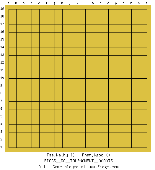 Last move : 0-1 2021 January 2 16:43:29 [Event "FICGS__GO__TOURNAMENT__000075"] [Site "FICGS"] [Date "2020.12.03"] [Round "1"] [Black "Tse,Kathy"] [White "Pham,Ngoc"] [Result "0-1"] 0-1 This go game has been lost on time (started : 2020.12.03 6:53:24) Here are the names of the openings (joseki) played in the four corners : Player White won this Go (weiqi, baduk) game. Follow this game move after move (download)Pon-nuki is worth thirty points. (Anonymous) A computer lets you make more mistakes faster than any invention in human history - with the possible exceptions of handguns and tequila. (Mitch Ratcliffe)