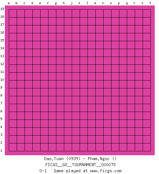 Last move : 0-1 2021 January 2 16:43:29 [Event "FICGS__GO__TOURNAMENT__000075"] [Site "FICGS"] [Date "2020.12.03"] [Round "1"] [Black "Dao,Tuan"] [White "Pham,Ngoc"] [Result "0-1"] [Rating 1 "0939"] 0-1 This go game has been lost on time (started : 2020.12.03 6:53:24) Here are the names of the openings (joseki) played in the four corners : Player White won this Go (weiqi, baduk) game. Follow this game move after move (download)A meijin needs no joseki. (Anonymous) Cactus - It is depressed cucumber. (Ilmars Cirulis)