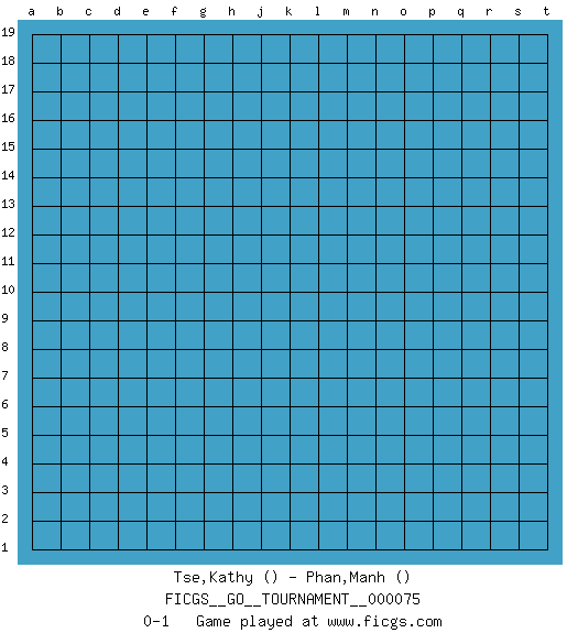 Last move : 0-1 2021 January 2 16:43:29 [Event "FICGS__GO__TOURNAMENT__000075"] [Site "FICGS"] [Date "2020.12.03"] [Round "1"] [Black "Tse,Kathy"] [White "Phan,Manh"] [Result "0-1"] 0-1 This go game has been lost on time (started : 2020.12.03 6:53:24) Here are the names of the openings (joseki) played in the four corners : Player White won this Go (weiqi, baduk) game. Follow this game move after move (download)Ikken tobi is never wrong. (Anonymous) When you stop learning you start dying. (M. Scott Adams)