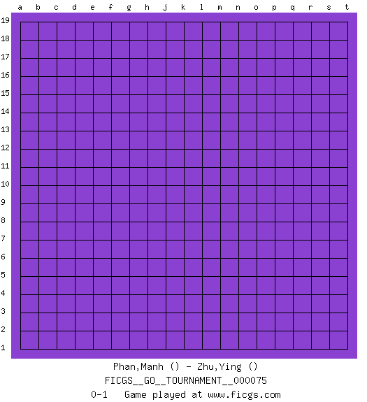 Last move : 0-1 2021 January 2 16:43:29 [Event "FICGS__GO__TOURNAMENT__000075"] [Site "FICGS"] [Date "2020.12.03"] [Round "1"] [Black "Phan,Manh"] [White "Zhu,Ying"] [Result "0-1"] 0-1 This go game has been lost on time (started : 2020.12.03 6:53:24) Here are the names of the openings (joseki) played in the four corners : Player White won this Go (weiqi, baduk) game. Follow this game move after move (download)Every move brings change. (Pierre Audouard) Programming can only do so much before it becomes too much. (Don Groves)