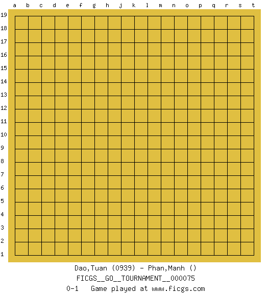 Last move : 0-1 2021 January 2 16:43:29 [Event "FICGS__GO__TOURNAMENT__000075"] [Site "FICGS"] [Date "2020.12.03"] [Round "1"] [Black "Dao,Tuan"] [White "Phan,Manh"] [Result "0-1"] [Rating 1 "0939"] 0-1 This go game has been lost on time (started : 2020.12.03 6:53:24) Here are the names of the openings (joseki) played in the four corners : Player White won this Go (weiqi, baduk) game. Follow this game move after move (download)In opponents' sphere of influence, avoid sharp conflict, don't move too deep. (Otake Hideo, 9p) Don't be irreplaceable, if you can't be replaced, you can't be promoted. (Dan Rotaru)
