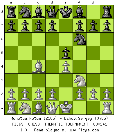 Last move : 1-0 2021 January 13 13:35:13 [Event "FICGS__CHESS__THEMATIC_TOURNAMENT__000241"] [Site "FICGS"] [Date "2020.12.04"] [Round "1"] [White "Monotua,Rotom"] [Black "Ezhov,Sergey"] [Result "1-0"] [WhiteElo "2305"] [BlackElo "0765"] 1.e4 e5 2.Bc4 Nf6 3.Nf3 1-0 This chess game has been lost on time (started : 2020.12.04 3:34:43) Bishop's Opening : Berlin defense Player White won this chess game. Follow this game move after move (download)Every Pawn is a potential Queen. (James Mason) Schach ist Kampf, hauptsächlich jedoch gegen die eigenen Fehler. (Savielly Grigorievitsch Tartakower) Con el fin de mejorar tu juego, debes de estudiar los finales antes que todo, ya que mientras que los finales pueden ser estudiados y dominados por sà mismos, el juegomedio y la apertura deben de ser estudiados en relación con los finales. (José Raúl Capablanca) 'L'échange des dames est un coup dur pour les deux adversaires...' Un journaliste lors d'une partie du match Spassky-Fischer Empty your mind, be formless, shapeless — like water. (Bruce Lee)