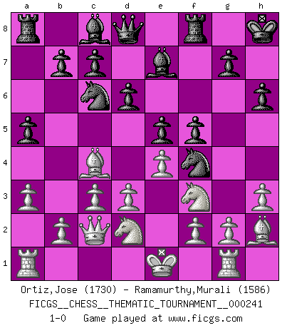 Last move : 1-0 2021 April 25 8:39:15 [Event "FICGS__CHESS__THEMATIC_TOURNAMENT__000241"] [Site "FICGS"] [Date "2020.12.04"] [Round "1"] [White "Ortiz,Jose"] [Black "Ramamurthy,Murali"] [Result "1-0"] [WhiteElo "1730"] [BlackElo "1586"] 1.e4 e5 2.Bc4 Bc5 3.Nf3 Nc6 4.c3 a5 5.a3 Nf6 6.d3 O-O 7.Bg5 h6 8.Bh4 Be7 9.Bg3 d6 10.h3 Nh5 11.Bh2 Kh8 12.Qc2 Nf4 13.Rg1 f5 14.Nbd2 1-0 This chess game has been lost on time (started : 2020.12.04 3:34:43) Bishop's Opening : Classical variation Kingside Castling by player Black (move 6) Player White won this chess game. Follow this game move after move (download)The stomach is an essential part of the Chess master. (Bent Larsen) Der 70jährige Viktor Kortschnoi: Die Rentenanstalt wollte mich zwingen in Rente zu gehen. Meine Frau erhält jetzt eine Pension- und ich zahle weiter in die Rentenkasse ein! (Viktor Kortschnoi) No volvere nunca a jugar contigo. Has insultado a mi amigo. - cuando un oponente se maldijo por una mala jugada (Miguel Najdorf) Demandez au pauvre Cg1 ce qu'il en pense. Eduard Gufeld à propos de la variante Saemisch de l'Est-Indienne. Chess is as much a mystery as women. (Purdy)