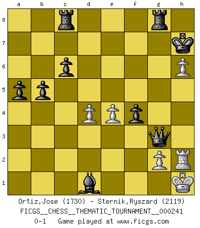 Last move : 0-1 2021 May 29 1:29:5 [Event "FICGS__CHESS__THEMATIC_TOURNAMENT__000241"] [Site "FICGS"] [Date "2020.12.04"] [Round "1"] [White "Ortiz,Jose"] [Black "Sternik,Ryszard"] [Result "0-1"] [WhiteElo "1730"] [BlackElo "2119"] 1.e4 e5 2.Bc4 Nf6 3.Nc3 Bc5 4.Nf3 d6 5.O-O a5 6.h3 O-O 7.a3 Be6 8.Be2 Nc6 9.d3 Nd4 10.Nxd4 Bxd4 11.Bg5 h6 12.Bh4 c6 13.Kh1 b5 14.f4 exf4 15.Bf3 g5 16.Be1 d5 17.Qe2 dxe4 18.Nxe4 Bxb2 19.Rb1 Bxa3 20.Bf2 Rc8 21.Bc5 Nxe4 22.Bxe4 Bxc5 23.Rbd1 Bd4 24.Qh5 Kg7 25.Rf3 f5 26.h4 Bf7 27.hxg5 Bxh5 28.Rh3 Bxd1 29.gxh6+ Kh7 30.c3 fxe4 31.cxd4 Rg8 32.dxe4 Qg5 33.Rh2 Qg3 0-1 Bishop's Opening : Berlin defense Kingside Castling by player White (move 5) Kingside Castling by player Black (move 6) Player Black won this chess game. Follow this game move after move (download)The enormous mental resilience, without which no Chess player can exist, was so much taken up by Chess that he could never free his mind of this game. (Albert Einstein) Das Schach ist nichts für kleine Geister, es beansprucht einen vollen Mann, der sich nicht sklavisch an das Überlieferte hält, sondern selbständig die Tiefen des Spiels zu ergründen sucht. (Wilhelm Steinitz) Cualquier cambio de material en una posición debe venir por medio de un mate, una captura o promoción de Peón. (Purdy) Lorsque vous vous retrouvez devant une position atroce, ne tendez pas un ultime piège dérisoire avec l'intention d'abandonner si l'adversaire le déjoue ! Faites-vous plutôt un devoir de résister comme si votre vie en dépendait. Jouez le coup qui vous déplairait au centuple si vous étiez dans la peau de votre tortionnaire ! Perfection is achieved, not when there is nothing more to add, but when there is nothing left to take away. (Antoine de Saint-Exupéry)