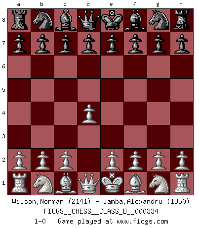 Last move : 1-0 2021 January 16 21:42:33 [Event "FICGS__CHESS__CLASS_B__000334"] [Site "FICGS"] [Date "2020.12.07"] [Round "1"] [White "Wilson,Norman"] [Black "Jamba,Alexandru"] [Result "1-0"] [WhiteElo "2141"] [BlackElo "1850"] 1.d4 1-0 This chess game has been lost on time (started : 2020.12.07 8:52:19) Queen's pawn Player White won this chess game. Follow this game move after move (download)In Chess, as it is played by masters, chance is practically eliminated. (Emanuel Lasker) Ich bin der einzige Schachspieler, der sich während der Vorbereitungen zum Turnier verletzt hat. (Woody Allen) No hay un Gran Maestro de Ajedrez que sea normal; solo se diferencían ellos por la magnitud de su locura. (Viktor Korchnoi) Comme les marins qui ont mille raisons différentes d'aller en mer, les joueurs d'échecs en ont tout autant avant de s'installer devant une table et jouer... (Vincent Bertignac, philosophe) Everybody lies. (Gregory House, House M.D.)