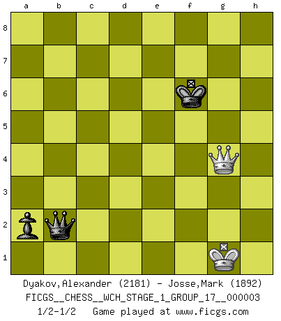 Last move : 1/2-1/2 2008 January 17 0:51:7 [Event "FICGS__CHESS__WCH_STAGE_1_GROUP_17__000003"] [Site "FICGS"] [Date "2007.07.11"] [Round "1"] [White "Dyakov,Alexander"] [Black "Josse,Mark"] [Result "1/2-1/2"] [WhiteElo "2181"] [BlackElo "1892"] 1.e4 c5 2.Nf3 d6 3.d4 cxd4 4.Nxd4 Nf6 5.Nc3 g6 6.Be3 Bg7 7.f3 Nc6 8.Qd2 O-O 9.Bc4 Bd7 10.O-O-O Rb8 11.h4 b5 12.Ndxb5 Ne5 13.Be2 Qa5 14.Nd4 Rfc8 15.Nb3 Rxb3 16.cxb3 Qxa2 17.Bc4 Qa5 18.Kb1 Nxc4 19.bxc4 Rxc4 20.Bh6 Bxh6 21.Qxh6 Be6 22.Qd2 Rc5 23.Kc2 Qa4+ 24.Kb1 Qb3 25.Rhe1 a5 26.Rc1 Qb4 27.e5 Rxe5 28.Rxe5 dxe5 29.g4 a4 30.Ne4 Qb3 31.Nxf6+ exf6 32.Rc3 Qa2+ 33.Kc2 Kg7 34.Kd1 h6 35.Ke2 f5 36.g5 f4 37.Rc5 Bc4+ 38.Kf2 a3 39.gxh6+ Kxh6 40.Qd8 Qxb2+ 41.Kg1 e4 42.Rxc4 e3 43.Qf8+ Kh5 44.Rc5+ f5 45.Rxf5+ gxf5 46.Qxf5+ Kh6 47.Qxf4+ Kg7 48.Qxe3 Kf7 49.Qc5 a2 50.Qc7+ Ke6 51.Qc6+ Ke5 52.Qc5+ Kf4 53.Qg5+ Kxf3 54.Qf5+ Kg3 55.Qg5+ Kh3 56.Qe3+ Kxh4 57.Qf4+ Kh5 58.Qf5+ Kh6 59.Qf4+ Kg6 60.Qg4+ Kf6 1/2-1/2 Sicilian : Dragon, Yugoslav attack Kingside Castling by player Black (move 8) Queenside Castling by player White (move 10) 10 pieces endgame at move 45 : White KQPP , Black KQPPPP WHITE : King + 1 Queen 2 Pawns BLACK : King + 1 Queen 4 Pawns 9 pieces endgame at move 46 : White KQPP , Black KQPPP WHITE : King + 1 Queen 2 Pawns BLACK : King + 1 Queen 3 Pawns 8 pieces endgame at move 47 : White KQPP , Black KQPP WHITE : King + 1 Queen 2 Pawns BLACK : King + 1 Queen 2 Pawns 7 pieces endgame at move 48 : White KQPP , Black KQP WHITE : King + 1 Queen 2 Pawns BLACK : King + 1 Queen 1 Pawn 6 pieces endgame at move 53 : White KQP , Black KQP WHITE : King + 1 Queen 1 Pawn BLACK : King + 1 Queen 1 Pawn 5 pieces endgame at move 56 : White KQ , Black KQP WHITE : King + 1 Queen BLACK : King + 1 Queen 1 Pawn This chess game ended in a draw. Follow this game move after move (download)If a ruler does not understand Chess, how can he rule over a kingdom ? (King Khusros II) Pläne sind die Träume des Verständigen. (Ernst Freiherr von Feuchtersleben) Yo tuve un dolor de muelas en la primer partida. En el segundo juego, tuve un dolor de cabeza. En el tercero, tuve un ataque de reumatísmo. En la cuarta partida, no me sentía muy bien. ¿Y en el quinto juego? Bueno, ¿que acaso uno tiene que ganar todos los juegos?. (Siegbert Tarrasch) Ce qui est bien, c'est d'avoir tout un tas de pièces en prise : l'adversaire ne peut en prendre qu'une à la fois. Cité par Thierry Audin. Computer Science is no more about computers than astronomy is about telescopes. (Edsger W. Dijkstra)