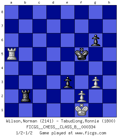 Last move : 1/2-1/2 2021 January 4 11:2:22 [Event "FICGS__CHESS__CLASS_B__000334"] [Site "FICGS"] [Date "2020.12.07"] [Round "1"] [White "Wilson,Norman"] [Black "Tabudlong,Ronnie"] [Result "1/2-1/2"] [WhiteElo "2141"] [BlackElo "1800"] 1.Nf3 Nf6 2.g3 d5 3.d4 c5 4.Bg2 cxd4 5.O-O h6 6.b3 e6 7.Bb2 Bc5 8.Bxd4 Bxd4 9.Qxd4 Nc6 10.Qb2 Rb8 11.Nbd2 b5 12.e4 dxe4 13.Ne5 Bb7 14.Nxe4 Nxe4 15.Bxe4 Nxe5 16.Qxe5 O-O 17.a4 b4 18.Rfd1 Qg5 19.Qxg5 hxg5 20.Bxb7 Rxb7 21.a5 Rc8 22.a6 Rbc7 23.Ra4 Rxc2 24.Rd7 R2c7 25.Rxc7 Rxc7 26.Rxb4 Rc6 27.Rb8+ Kh7 28.Rb7 Rxa6 29.Rxf7 Kg6 30.Rf3 g4 31.Rf4 Kg5 32.Kg2 e5 33.Rf7 g6 34.Rf8 Rb6 35.Ra8 a6 36.h3 gxh3+ 37.Kxh3 Rf6 38.Kg2 Rb6 39.b4 Rxb4 40.Rxa6 e4 41.Kf1 Rb2 42.Ra4 Kf5 43.Ra1 e3 44.Ra5+ 1/2-1/2 Reti Opening Kingside Castling by player White (move 5) Kingside Castling by player Black (move 16) 10 pieces endgame at move 37 : White KRPPP , Black KRPPP WHITE : King + 1 Rook 3 Pawns BLACK : King + 1 Rook 3 Pawns 9 pieces endgame at move 39 : White KRPP , Black KRPPP WHITE : King + 1 Rook 2 Pawns BLACK : King + 1 Rook 3 Pawns 8 pieces endgame at move 40 : White KRPP , Black KRPP WHITE : King + 1 Rook 2 Pawns BLACK : King + 1 Rook 2 Pawns This chess game ended in a draw. Follow this game move after move (download)Different people feel differently about resigning. (Bobby Fischer) Ein typischer, sehr verbreiteter Gedankenschädling ist der, daß der betreffende Amateur von der Annanhme ausgeht, daß jeder einzelne Zug etwas zu leisten habe. (Aaron Nimzowitsch) Peones: ellos son el alma de esta partida, solos forman el ataque y la defensa. (Philidor) Le système Elo représente seulement une moyenne. Il est simplement un indicateur de votre stabilité. (Anatoli Karpov) Thus, what is of supreme importance in war is to attack the enemy's strategy. (Sun Tzu)