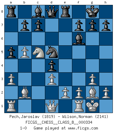 Last move : 1-0 2021 March 8 11:56:46 [Event "FICGS__CHESS__CLASS_B__000334"] [Site "FICGS"] [Date "2020.12.07"] [Round "1"] [White "Pech,Jaroslav"] [Black "Wilson,Norman"] [Result "1-0"] [WhiteElo "1819"] [BlackElo "2141"] 1.c4 e5 2.Nc3 Nf6 3.Nf3 Nc6 4.g3 d5 5.cxd5 Nxd5 6.Bg2 Nb6 7.O-O Be7 8.d3 O-O 9.a3 Re8 10.b4 a5 11.b5 Nd4 12.Nxd4 exd4 13.Na4 Bf6 14.Nc5 Nd5 15.Bb2 1-0 English Opening Kingside Castling by player White (move 7) Kingside Castling by player Black (move 8) Player White won this chess game. Follow this game move after move (download)Chess is a cold bath for the mind. (Sir John Simon) Ein Isolani verdüstert die Stimmung auf dem ganzen Schachbrett. (Savielly Grigorievitsch Tartakower) Nada excita más a Grandes Maestros aburridos que una novedad teórica. (Dominic Lawson) Botvinnik disait en comparant les échecs à la musique: Il existe une science dont le but est l'étude de l'acoustique et des sons. Mais il y a aussi un art qui se sert de l'océan des sons : c'est la musique. De toute évidence, il en est de même pour la pensée. La logique est l'étude des lois de la réflexion et les échecs reflètent, en tant qu'art, le côté logique de la réflexion, sous la forme d'images artistiques... Extrait de Fischer - Spassky, Reykjavik 1972 par Alexander & F. Wyndham (Ed. Solar), p 37. Mac users swear by their computers. PC users swear at their computers. (Author unknown)