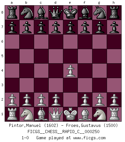 Last move : 1-0 2021 January 8 4:58:47 [Event "FICGS__CHESS__RAPID_C__000250"] [Site "FICGS"] [Date "2020.12.08"] [Round "1"] [White "Pintor,Manuel"] [Black "Froes,Gustavus"] [Result "1-0"] [WhiteElo "1602"] [BlackElo "1500"] 1.e4 1-0 This chess game has been lost on time (started : 2020.12.08 16:27:53) King's pawn Opening Player White won this chess game. Follow this game move after move (download)Good positions don't win games, good moves do. (Gerald Abrahams) Ein guter Spieler hat immer Glück. (José Raúl Capablanca) La táctica fluye a partir de una posición superior. (Bobby Fischer) En blitz, le Cavalier l'emporte sur le Fou. (Vlastimil Hort) All the biggest technological inventions created by man - the airplane, the automobile, the computer - says little about his intelligence, but speaks volumes about his laziness. (Mark Kennedy)