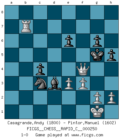 Last move : 1-0 2021 January 17 19:27:2 [Event "FICGS__CHESS__RAPID_C__000250"] [Site "FICGS"] [Date "2020.12.08"] [Round "1"] [White "Casagrande,Andy"] [Black "Pintor,Manuel"] [Result "1-0"] [WhiteElo "1800"] [BlackElo "1602"] 1.d4 d5 2.c4 c6 3.Nf3 Bg4 4.Ne5 Bh5 5.Qb3 Qb6 6.Qh3 Nf6 7.Qc8+ Qd8 8.Qxb7 Nbd7 9.Nxc6 Qc8 10.Qxc8+ Rxc8 11.Nxa7 Rxc4 12.Na3 Rxd4 13.N3b5 Rc4 14.e3 Rc5 15.b4 Rc2 16.Bd3 Rc4 17.Bxc4 dxc4 18.Nc6 Nb6 19.a4 e6 20.O-O Nfd5 21.a5 Na8 22.f3 Nxb4 23.Nxb4 Bxb4 24.Ba3 Bxa3 25.Rxa3 O-O 26.Rb1 Bg6 27.Rb4 h5 28.a6 Rd8 29.a7 Kh7 30.Nc3 Bd3 31.Rb8 Rg8 32.Ra5 g6 33.Rab5 Nc7 34.Rxg8 Kxg8 35.Rb7 Nd5 36.a8Q+ Kg7 37.Qe8 Nxc3 38.Qxf7+ Kh6 39.Qf8+ Kg5 40.Qf4+ 1-0 QGD Slav : 3.Nf3 Kingside Castling by player White (move 20) Kingside Castling by player Black (move 25) Promotion Queen by player White (move 36) Player White won this chess game. Follow this game move after move (download)Combinations have always been the most intriguing aspect of Chess. The masters look for them, the public applauds them, the critics praise them. It is because combinations are possible that Chess is more than a lifeless mathematical exercise. They are the poetry of the game; they are to Chess what melody is to music. They represent the triumph of mind over matter. (Reuben Fine) Du musst nicht gut spielen, es reicht, wenn du besser spielst als dein Gegner. (Anonymous) Una de estas pequeñas movidas modestas pudieran ser mas molestas a tu oponente que la amenaza mas grande. (Siegbert Tarrasch) Soyez une menace à chaque fois que vous vous asseyez pour jouer. (Ken Smith) Shallow men believe in luck. Strong men belive in cause and effect. (Ralph Waldo Emerson)