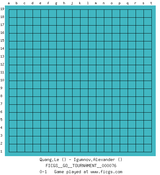 Last move : 0-1 2021 January 10 7:47:56 [Event "FICGS__GO__TOURNAMENT__000076"] [Site "FICGS"] [Date "2020.12.10"] [Round "1"] [Black "Quang,Le"] [White "Igumnov,Alexander"] [Result "0-1"] 0-1 This go game has been lost on time (started : 2020.12.10 21:23:43) Here are the names of the openings (joseki) played in the four corners : Player White won this Go (weiqi, baduk) game. Follow this game move after move (download)Empty triangles are bad. (Anonymous) Real knowledge is to know the extent of one's ignorance. (Confucius)