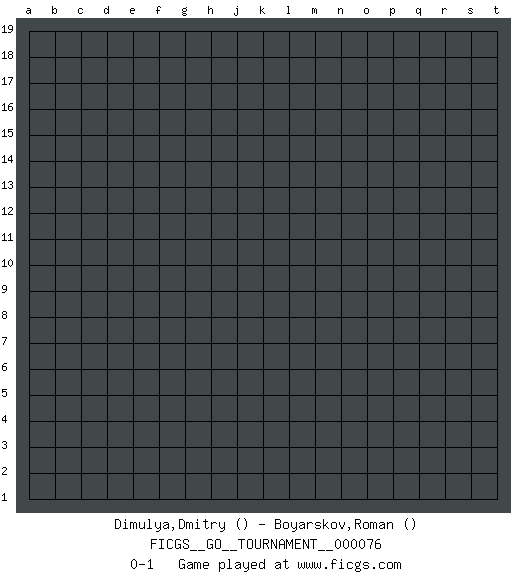Last move : 0-1 2021 January 10 7:47:56 [Event "FICGS__GO__TOURNAMENT__000076"] [Site "FICGS"] [Date "2020.12.10"] [Round "1"] [Black "Dimulya,Dmitry"] [White "Boyarskov,Roman"] [Result "0-1"] 0-1 This go game has been lost on time (started : 2020.12.10 21:23:43) Here are the names of the openings (joseki) played in the four corners : Player White won this Go (weiqi, baduk) game. Follow this game move after move (download)The enemy's vital point is your own. (Anonymous) Man is reluctant to give credit for intelligence to anyone, except his enemies. (Albert Einstein)