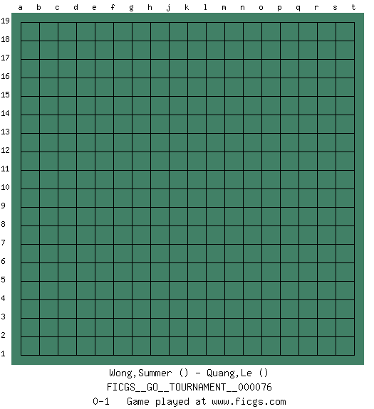 Last move : 0-1 2021 January 10 7:47:56 [Event "FICGS__GO__TOURNAMENT__000076"] [Site "FICGS"] [Date "2020.12.10"] [Round "1"] [Black "Wong,Summer"] [White "Quang,Le"] [Result "0-1"] 0-1 This go game has been lost on time (started : 2020.12.10 21:23:43) Here are the names of the openings (joseki) played in the four corners : Player White won this Go (weiqi, baduk) game. Follow this game move after move (download)The nature of a game comes from what is played, but it's the sensitivity to the possible and the impossible that gives it value. (Pierre Audouard) A person who never made a mistake never tried anything new. (Albert Einstein)
