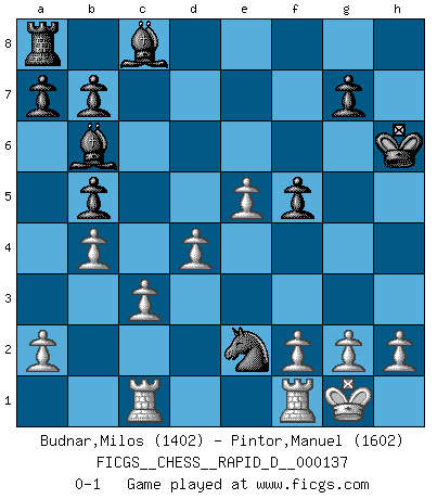 Last move : 0-1 2021 January 15 18:59:21 [Event "FICGS__CHESS__RAPID_D__000137"] [Site "FICGS"] [Date "2020.12.14"] [Round "1"] [White "Budnar,Milos"] [Black "Pintor,Manuel"] [Result "0-1"] [WhiteElo "1402"] [BlackElo "1602"] 1.e4 e5 2.Nf3 Nc6 3.Bb5 Qf6 4.c3 Bc5 5.O-O Nge7 6.b4 Bb6 7.d3 O-O 8.Bg5 Qg6 9.Bxe7 Nxe7 10.Nxe5 Qg5 11.Nxd7 c6 12.Nxf8 cxb5 13.Nxh7 Kxh7 14.Qf3 f5 15.Nd2 Qxd2 16.Qh5+ Qh6 17.Qxh6 Kxh6 18.e5 Nd5 19.Rac1 Nf4 20.d4 Ne2+ 0-1 Ruy Lopez (Spanish Opening) Kingside Castling by player White (move 5) Kingside Castling by player Black (move 7) Player Black won this chess game. Follow this game move after move (download)The essence of Chess is thinking about what Chess is. (David Bronstein) Ich habe Kasparov in Rente geschickt. (Veselin Topalov) Uno no tiene que jugar muy bien, es suficiente jugar mejor que el oponente. (Siegbert Tarrasch) On est toujours la mazette de quelqu'un d'autre. (Anonyme) There's always a bigger fish. (Qui-Gon Jinn in Star Wars ep.1)