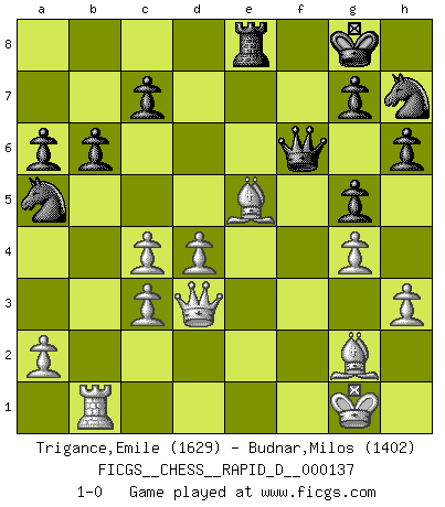 Last move : 1-0 2021 February 9 6:20:15 [Event "FICGS__CHESS__RAPID_D__000137"] [Site "FICGS"] [Date "2020.12.14"] [Round "1"] [White "Trigance,Emile"] [Black "Budnar,Milos"] [Result "1-0"] [WhiteElo "1629"] [BlackElo "1402"] 1.c4 Nf6 2.Nc3 e5 3.Nf3 Nc6 4.g3 Bb4 5.Bg2 O-O 6.O-O Bxc3 7.bxc3 d6 8.d3 h6 9.e4 Bg4 10.h3 Bh5 11.g4 Bg6 12.Nh4 Nh7 13.Nxg6 fxg6 14.f4 exf4 15.Bxf4 g5 16.Bg3 Rxf1 17.Bxf1 Qf6 18.d4 Re8 19.Qd3 a6 20.Rb1 b6 21.Bg2 Na5 22.e5 dxe5 23.Bxe5 1-0 English Opening Kingside Castling by player Black (move 5) Kingside Castling by player White (move 6) Player White won this chess game. Follow this game move after move (download)What is the object of playing a gambit opening?... To acquire a reputation of being a dashing player at the cost of losing a game. (Siegbert Tarrasch) Irgendwie scheint mir sonntags früh um 9 Uhr der Killerinstinkt verloren gegangen zu sein. (Alexej Shirov) La esencia del Ajedrez es pensar acerca de lo que el Ajedrez es. (David Bronstein) Les pièces de l'échiquier étaient impitoyables. Elles le retenaient, elles l'absorbaient. Il y avait de l'horreur en cela, mais aussi une harmonie unique. Car, qu'y a-t-il dans le monde, à part les échecs ? (V. Nabokov) The ultimate in disposing one's troops is to be without ascertainable shape. Then the most penetrating spies cannot pry in nor can the wise lay plans against you. (Sun Tzu)