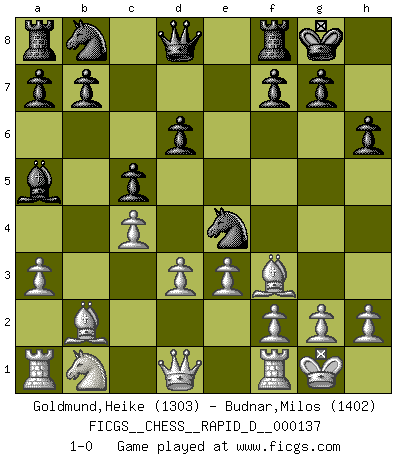 Last move : 1-0 2021 January 15 19:2:43 [Event "FICGS__CHESS__RAPID_D__000137"] [Site "FICGS"] [Date "2020.12.14"] [Round "1"] [White "Goldmund,Heike"] [Black "Budnar,Milos"] [Result "1-0"] [WhiteElo "1303"] [BlackElo "1402"] 1.b4 e5 2.Bb2 Bxb4 3.Bxe5 Nf6 4.c4 d6 5.Bb2 O-O 6.e3 c5 7.Nf3 h6 8.a3 Ba5 9.Be2 Bg4 10.O-O Ne4 11.d3 Bxf3 12.Bxf3 1-0 Polish (Sokolsky) opening Kingside Castling by player Black (move 5) Kingside Castling by player White (move 10) Player White won this chess game. Follow this game move after move (download)Different people feel differently about resigning. (Bobby Fischer) Das Zentrum ist der Balkan des Schachbretts - Kriegshandlungen können in jedem Moment ausbrechen. (Aaron Nimzowitsch) Debes de llevar a tu oponente hacia un profundo y obscuro bosque donde 2+2=5, y el camino que conduce a la salida es suficientemente ancho para solamente uno. (Mikhail Tal) Le moment que je préfère le plus dans une rencontre, c'est celui où je sens que la personnalité de l'adversaire se brise. (Robert Fischer) The only difference between a tax man and a taxidermist is that the taxidermist leaves the skin. (Mark Twain)