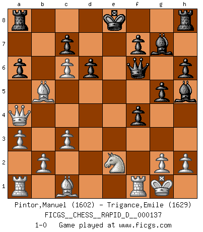 Last move : 1-0 2021 January 18 18:43:36 [Event "FICGS__CHESS__RAPID_D__000137"] [Site "FICGS"] [Date "2020.12.14"] [Round "1"] [White "Pintor,Manuel"] [Black "Trigance,Emile"] [Result "1-0"] [WhiteElo "1602"] [BlackElo "1629"] 1.e4 e5 2.f4 exf4 3.Nf3 g5 4.Bc4 Bg7 5.d4 d6 6.O-O h6 7.Nc3 Nc6 8.a3 Bg4 9.Ne2 Nf6 10.e5 Bxf3 11.exf6 Qxf6 12.c3 Bh5 13.Qb3 Na5 14.Qa4+ Nc6 15.d5 a6 16.dxc6 b5 17.Bxb5 1-0 King's knight's gambit Kingside Castling by player White (move 6) Player White won this chess game. Follow this game move after move (download)I believe that Chess possesses a magic that is also a help in advanced age. A rheumatic knee is forgotten during a game of Chess and other events can seem quite unimportant in comparison with a catastrophe on the chessboard. (Vlastimil Hort) Frage: Wie viele Autos haben Sie schon zerstört? - Antwort: Nur zwei. (Loek van Wely) Un entendimiento a fondo de las continuaciones típicas del mate, hace de las combinaciones de sacrificio mas complicadas conducirlas a ellas no solo sin dificultad, sino casi de una manera natural. (Siegbert Tarrasch) Les Echecs sont affaire de jugement sensible. Savoir quand frapper et quand esquiver. (Fischer) . 'gn is not allowed in chess unless n is an integer between 1 and 8 inclusive, where 1 and 8 are to interpreted as the standard numerals standing for integers in the ordered real-closed field R, with the *canonical* ordering. (As opposed to, say, an integer in the domain Z[2+i*sqrt(5)] or an integer in some exotic Grothendieck topos). (Normajean Yates)