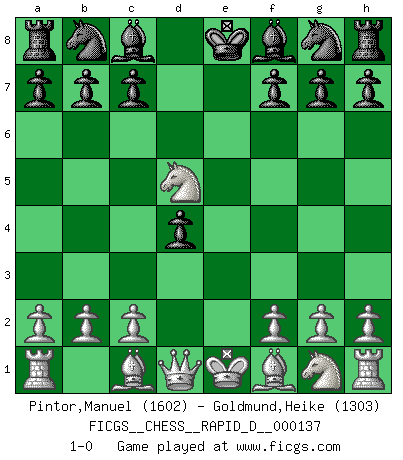Last move : 1-0 2020 December 17 17:18:9 [Event "FICGS__CHESS__RAPID_D__000137"] [Site "FICGS"] [Date "2020.12.14"] [Round "1"] [White "Pintor,Manuel"] [Black "Goldmund,Heike"] [Result "1-0"] [WhiteElo "1602"] [BlackElo "1303"] 1.e4 d5 2.exd5 Qxd5 3.d4 e5 4.Nc3 exd4 5.Nxd5 1-0 Scandinavian (centre counter) defense Player White won this chess game. Follow this game move after move (download)A good player is always lucky. (Jose Raul Capablanca) Deine Wertungszahl - vorausgesetzt einige Jahre schachliche Anstrengung - entspricht etwa dem zehnfachen Deines IQ plus 1000. (Jonathan Levitt) Siempre es mucho mejor sacrificar las piezas de tu oponente. (Savielly Tartakover) Pour moi, les échecs ne sont pas un jeu mais un art. (Alexandre Alekhine) All art requires courage. (Anne Tucker)