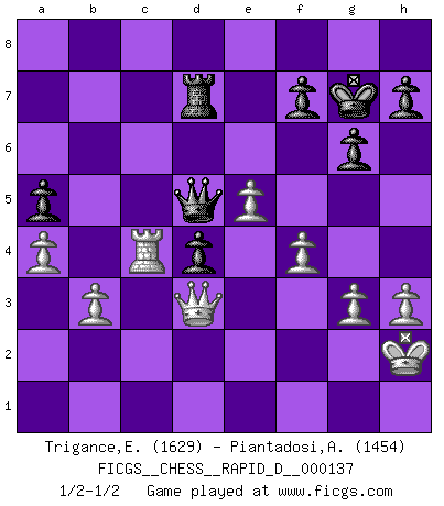 Last move : 1/2-1/2 2021 March 22 17:59:38 [Event "FICGS__CHESS__RAPID_D__000137"] [Site "FICGS"] [Date "2020.12.14"] [Round "1"] [White "Trigance,Emile"] [Black "Piantadosi,Angelo"] [Result "1/2-1/2"] [WhiteElo "1629"] [BlackElo "1454"] 1.c4 e5 2.Nc3 Nf6 3.Nf3 d6 4.d4 exd4 5.Nxd4 Be7 6.g3 Nc6 7.Nxc6 bxc6 8.Bg2 Bd7 9.O-O O-O 10.e4 Re8 11.f3 c5 12.Rb1 c6 13.b3 Be6 14.Bb2 d5 15.e5 Nd7 16.cxd5 cxd5 17.f4 Rc8 18.Bxd5 Nf8 19.Qf3 Bxd5 20.Nxd5 Ne6 21.Rfd1 Qa5 22.a4 Nd4 23.Bxd4 cxd4 24.Nxe7+ Rxe7 25.Rbc1 Rd8 26.Qd3 Rc7 27.Rc4 Qb6 28.Rdc1 Rcd7 29.Rc8 Kf8 30.R1c6 Qb7 31.Rxd8+ Rxd8 32.Rc4 a5 33.h3 g6 34.Kh2 Qd5 35.Kg1 Kg7 36.Kh2 Rd7 37.Kg1 Rd8 38.Kh2 Rd7 1/2-1/2 English Opening Kingside Castling by player White (move 9) Kingside Castling by player Black (move 9) This chess game ended in a draw. Follow this game move after move (download)Fischer was a master of clarity and a king of artful positioning. His opponents would see where he was going but were powerless to stop him. (Bruce Pandolfini) Jeder Fehler erscheint unglaublich dumm, wenn andre ihn begehen. (Georg Christoph Lichtenberg) El Ajedrez es un regaderazo frío para la mente. (Sir John Simon) Même un GMI sait rarement calculer sur plus de cinq coups une attaque à sacrifices. (Rudolf Spielmann) A good book on your shelf is a friend that turns its back on you and remains a friend. (Author unknown)