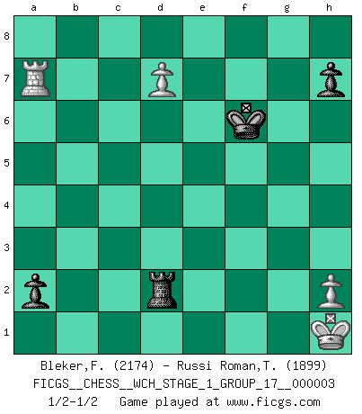 Last move : 1/2-1/2 2007 November 18 14:44:46 [Event "FICGS__CHESS__WCH_STAGE_1_GROUP_17__000003"] [Site "FICGS"] [Date "2007.07.11"] [Round "1"] [White "Bleker,Frits"] [Black "Russi Roman,Tano-Urayoan"] [Result "1/2-1/2"] [WhiteElo "2174"] [BlackElo "1899"] 1.d4 Nf6 2.c4 c5 3.d5 b5 4.cxb5 a6 5.bxa6 Bxa6 6.Nc3 g6 7.Nf3 d6 8.g3 Bg7 9.Bg2 Nfd7 10.Qc2 Nb6 11.Nd2 O-O 12.b3 Bb7 13.Bb2 e6 14.O-O Nxd5 15.Nxd5 Bxb2 16.Qxb2 Bxd5 17.e4 Bb7 18.Rfd1 Nc6 19.b4 cxb4 20.Nc4 e5 21.Nxd6 Qe7 22.Nc4 Rab8 23.Rac1 f6 24.Nb6 Nd4 25.Nd5 Bxd5 26.exd5 Rfc8 27.f4 Rxc1 28.Rxc1 Qa7 29.Kh1 Qa3 30.Qxa3 bxa3 31.fxe5 fxe5 32.Be4 Nf5 33.Bxf5 gxf5 34.Re1 e4 35.g4 Rb2 36.d6 Kf7 37.gxf5 Rxa2 38.Rxe4 Rd2 39.Re7+ Kf6 40.Ra7 a2 41.d7 Ke7 42.f6+ Kxf6 1/2-1/2 Benko gambit accepted Kingside Castling by player Black (move 11) Kingside Castling by player White (move 14) 10 pieces endgame at move 37 : White KRPPP , Black KRPPP WHITE : King + 1 Rook 3 Pawns BLACK : King + 1 Rook 3 Pawns 9 pieces endgame at move 38 : White KRPPP , Black KRPP WHITE : King + 1 Rook 3 Pawns BLACK : King + 1 Rook 2 Pawns 8 pieces endgame at move 42 : White KRPP , Black KRPP WHITE : King + 1 Rook 2 Pawns BLACK : King + 1 Rook 2 Pawns This chess game ended in a draw. Follow this game move after move (download)When you absolutely don't know what to do anymore, it is time to panic. (John van der Wiel) Versuche, dich von der Sklaverei der Eröffnungsvarianten zu befreien. Stattdessen soll man gewisse Typenpositionen erlernen, die man eingehend analysiert. (Aaron Nimzowitsch) Todos los jugadores de Ajedrez deberían tener un pasatiempo. (Savielly Tartakower) Je ne crois pas en la psychologie, je crois aux bons coups. (Robert Fischer) To be champion requires more than simply being a strong player; one has to be a strong human being as well. (Anatoly Karpov)